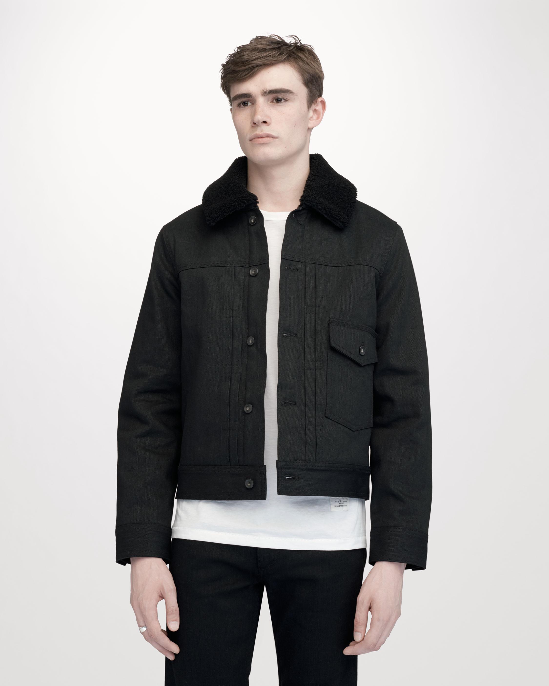 Flap pocket at front. Shop the latest designer collections at NET-A-PORTER. Is on sale for 99. Similar ones also available. Rag bone s Bartack denim jacket is lined in plush shearling save for the sleeves - theyre backed in quilted shell to allow for easy movement. From Rag Bone. Next-day shipping and free returns available on all orders. Crafted in the USA the denim jacket boasts a sheep shearling collar and quilted sleeve lining. Adjustable button-tabs at back waist.